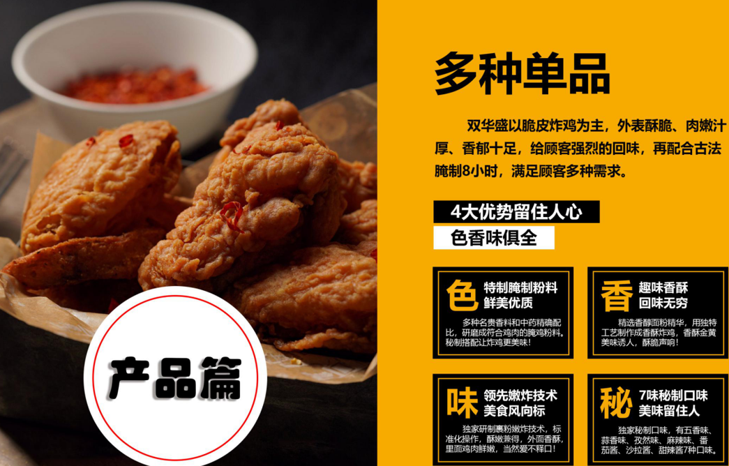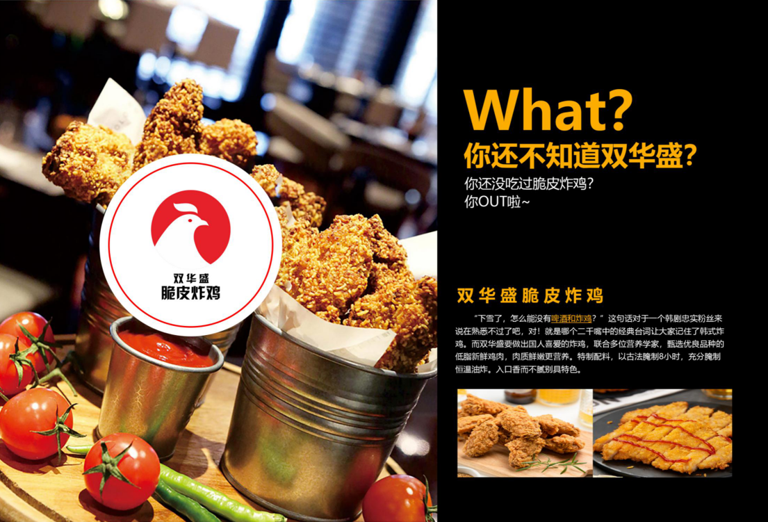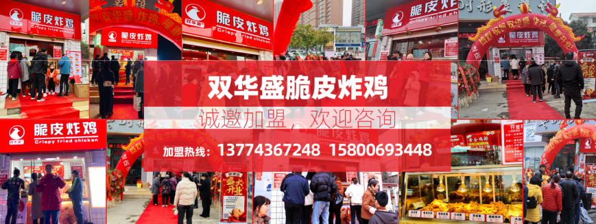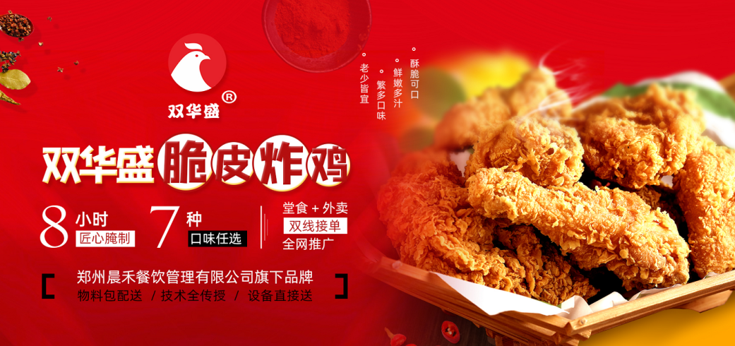 加盟双华盛脆皮炸鸡,开小店做大生意,出餐快,堂食+外卖,产品四季更新,加盟无需经验,免费培训,宣传总部全程负责!物料包配送/技术全传授/设备直接送。