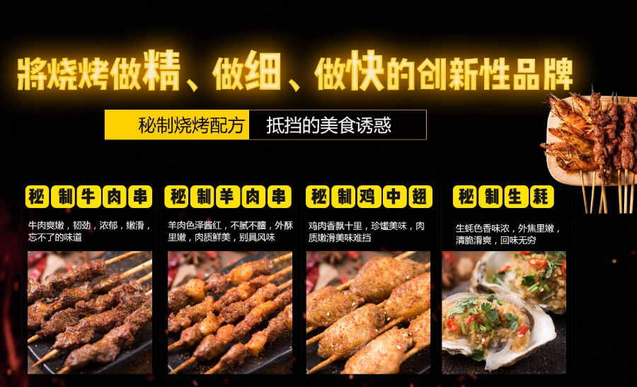 作为一个坚持不断创立新产品的品牌,希望能够打造出更多的人气门店,那么首先要在产品方面做出努力。坚持挑选新鲜材料,每天都要经过严格检测,要做到美味的口感也要有标准的配比,所以每款烧烤既有营养又好吃。出餐的速度也特别快,能够让每个员工掌握住具体的操作工艺服务与进店的顾客。另外,在销售中也增加了外卖渠道,那么每一个外卖的人可以收到包装特别美的烧烤,简直特别爽。因此,把这些产品优势直接带给创业伙伴,能够打造出更强的产品优势。